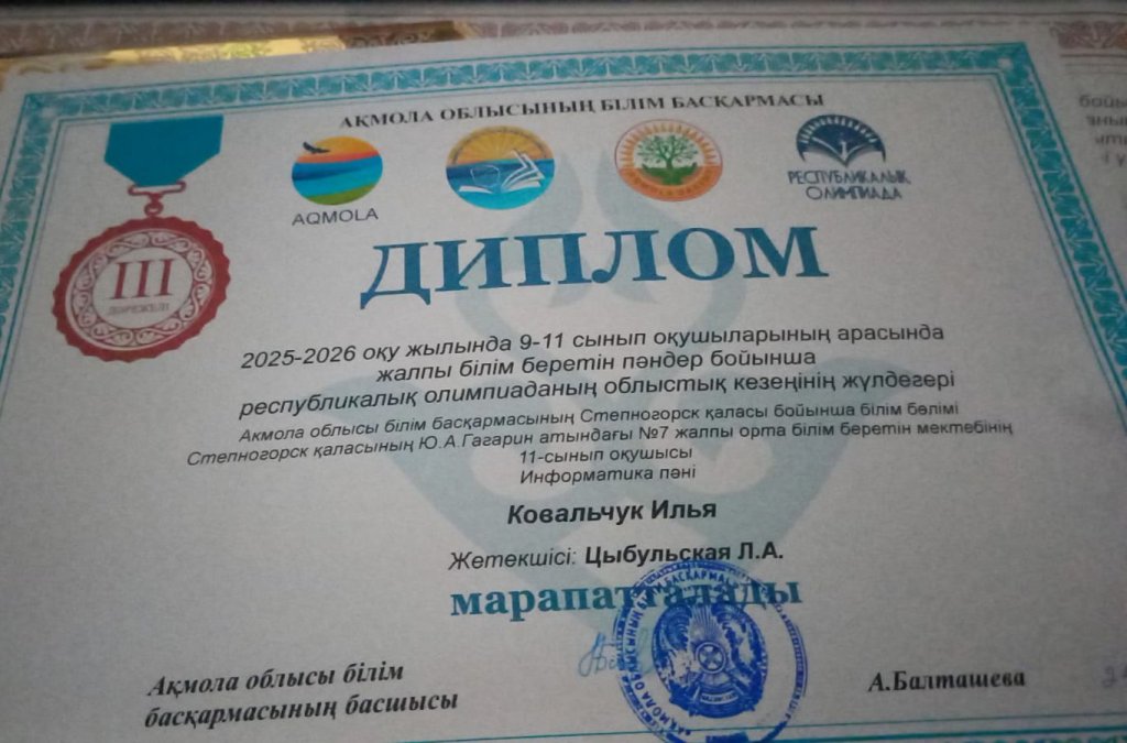 11 «Б» сынып оқушысы Ковальчук Илья информатика пәні бойынша ІІІ орын иеленді 👏
