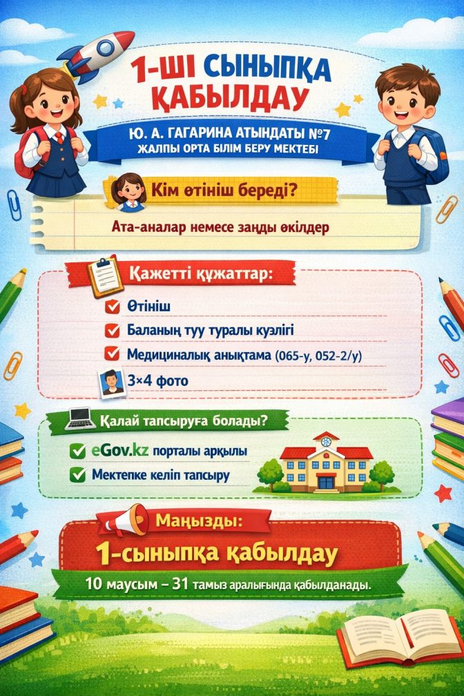 1-сыныпқа өтініштер 10 маусымнан 31 тамызға дейін қабылданады.